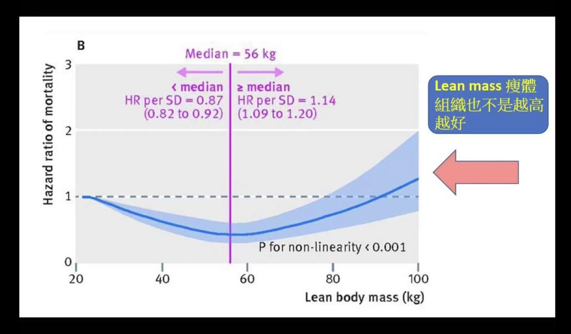 然而,瘦體組織(簡單來說就是肌肉量)降低,才會提升死亡率(如圖三)。